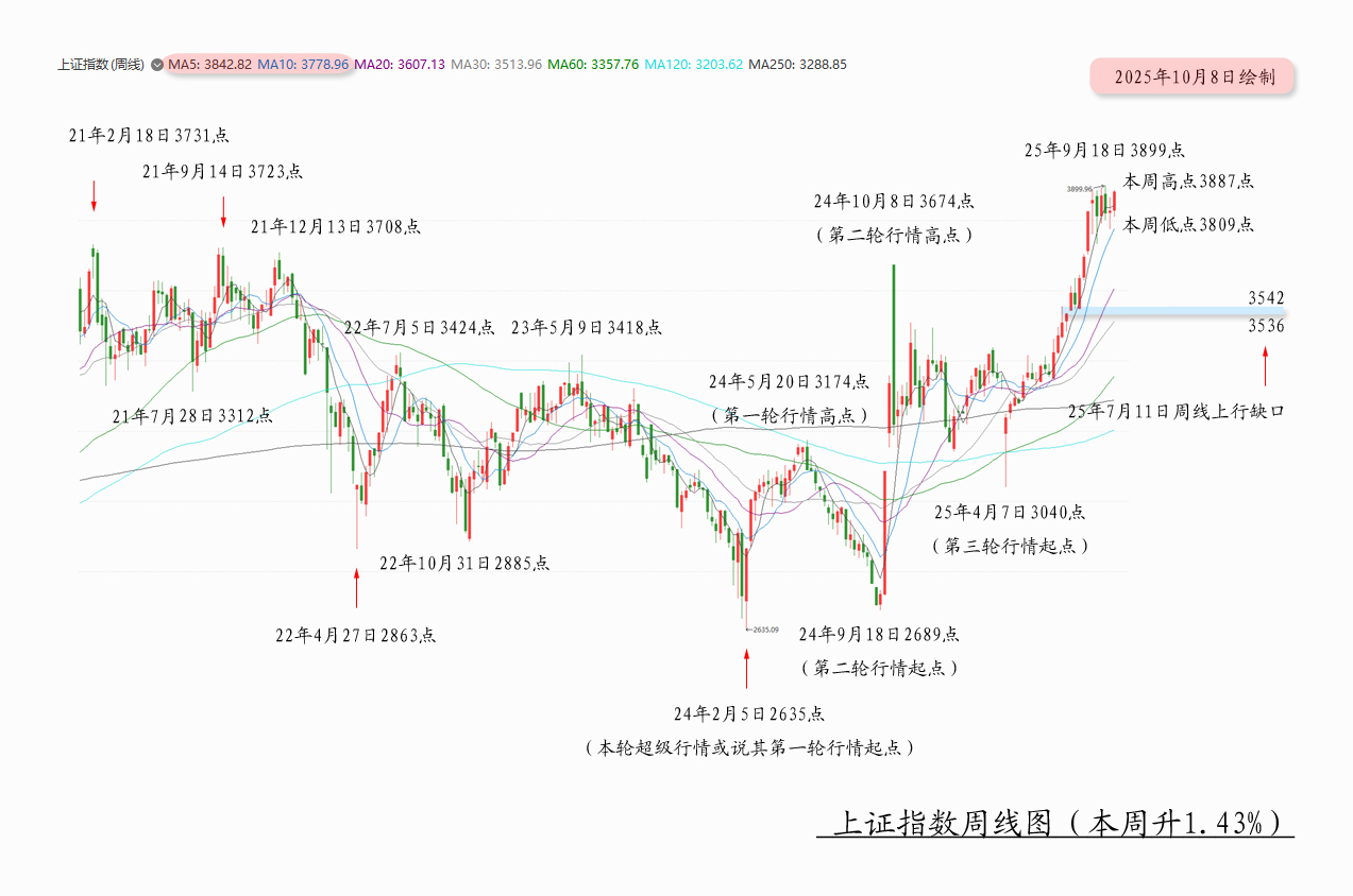 本期周评共计7000字和18副图,此后3900字和14副图为付费内容,旨在分析上证指数本轮超级行情24年2月5日2635点启动至今,特别是其第三轮行情25年4月7日3040点启动至今,最高升至25年9月18日3899点之后的中线后续走势、未来一、两周短线如何演绎及相应的阶段性操作建议。