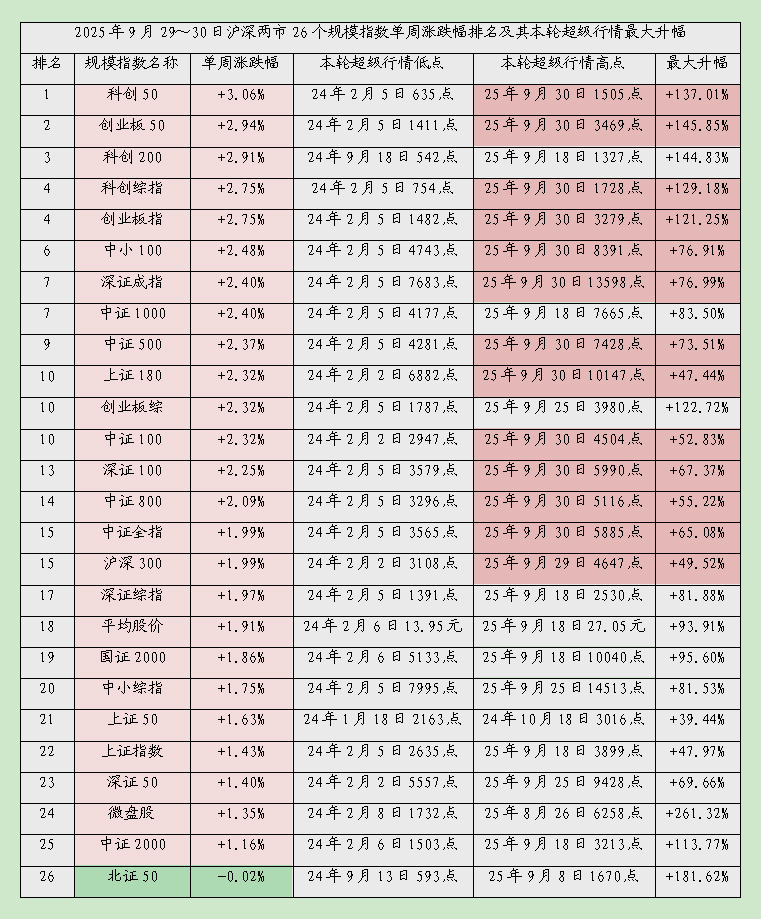同期,在我所统计的26个规模指数之中,除了微跌0.02%的北证50以外,其它全部飘红。其中,科创50、创业板50、科创200、科创综指和创业板指等中小指数大幅领先,北证50、中证2000和微盘股等中小指数中小指数殿后。另外,有11个规模指数再创本轮超级行情新高。