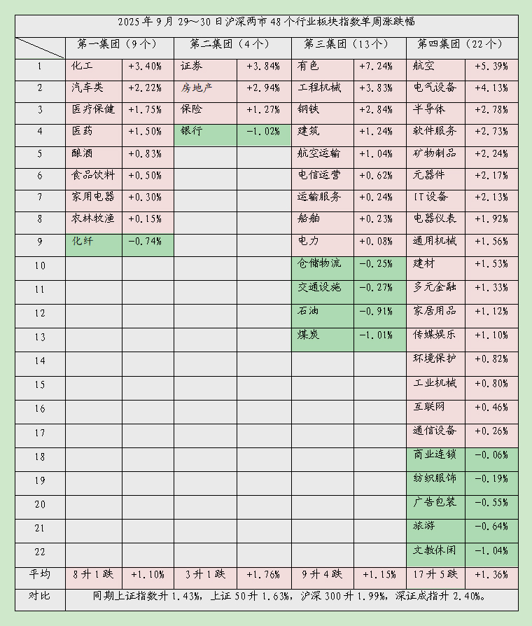 本周对大盘影响最大的四大集团各大行业板块表现如下: