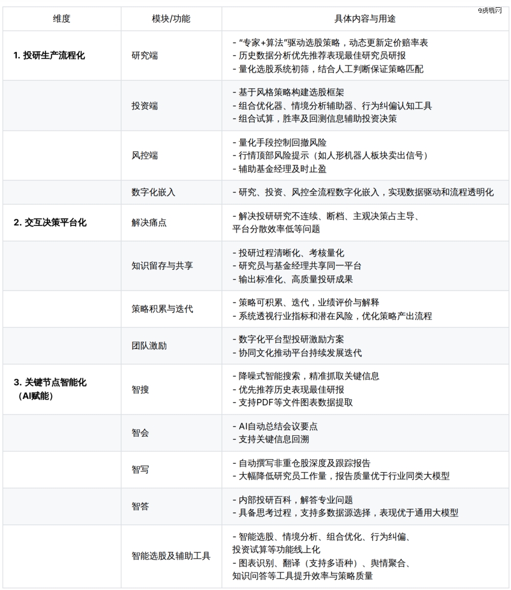 这意味着,整个投研过程都在线上进行,一切留痕,可追溯,成果可复制,并且通过数字化平台和AI技术来提升投研效能。