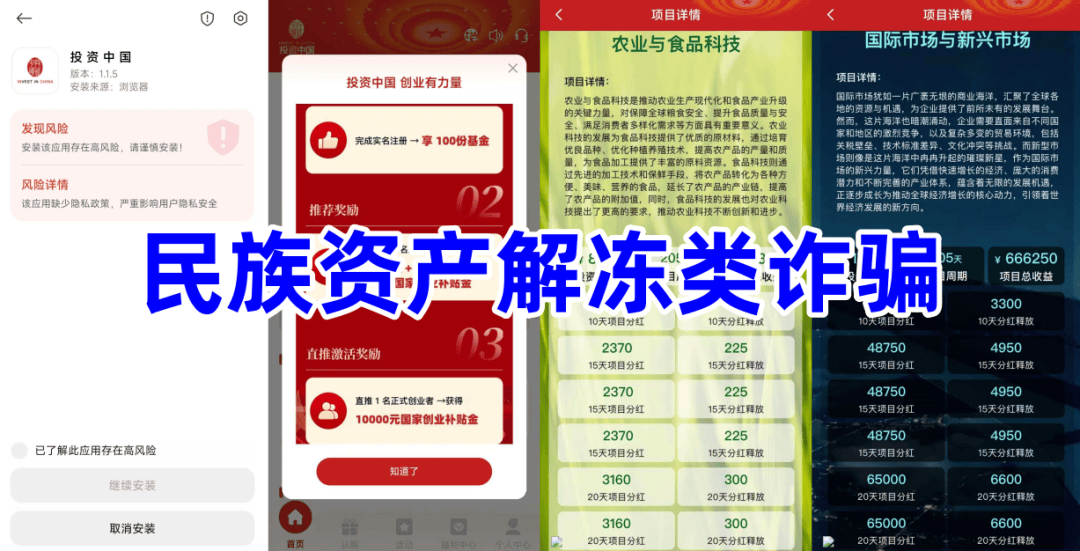 不法分子冒充“国家数据局”的名义,制作散布涉诈APP,声称注册即可获得“创业补贴金”、100份基金,发展下线创业补贴金。同时推出“农业与食品科技”“国际市场与新兴市场”等高额返利理财项目。