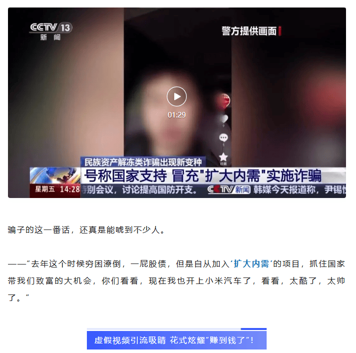 其中,“民族资产解冻”类虚假理财诈骗尤为典型,其往往打着“国家支持”“秘密项目”“民族大业”等旗号,通过虚构历史资产、伪造、编造宏大叙事等手段,诱骗受害人投入资金,造成巨额财产损失,更严重侵蚀社会信任基础。