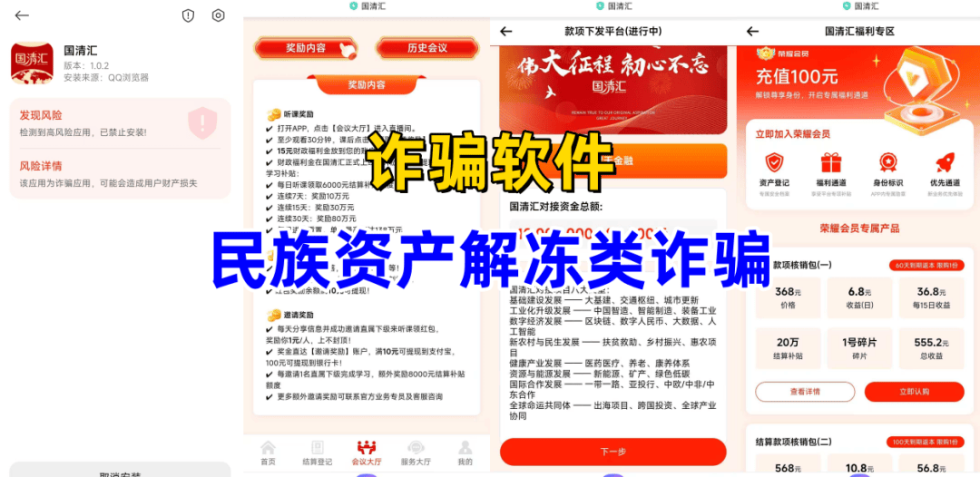 不法分子冒充“中国扶贫基金会”“中国银行”“中国平安资产公司”等名义,宣传“国清汇”平台是国家专项清算行动的资产托管平台。每天听课学习可领取6000元结算补贴,连续签到可领取138万元。