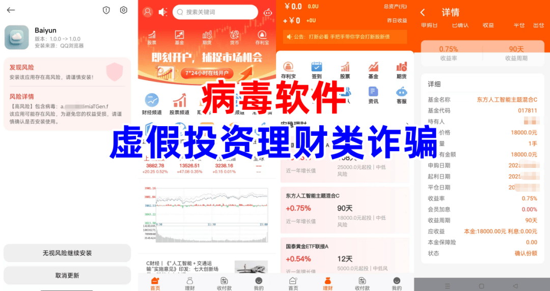 不法分子冒充某公司的名义,制作散步涉诈APP,虚构推广“富蝼国纹鈣輸医药创新股票A”“东方人工智能主题混合C”“国泰黄金ETF联接A”等高额返利项目。