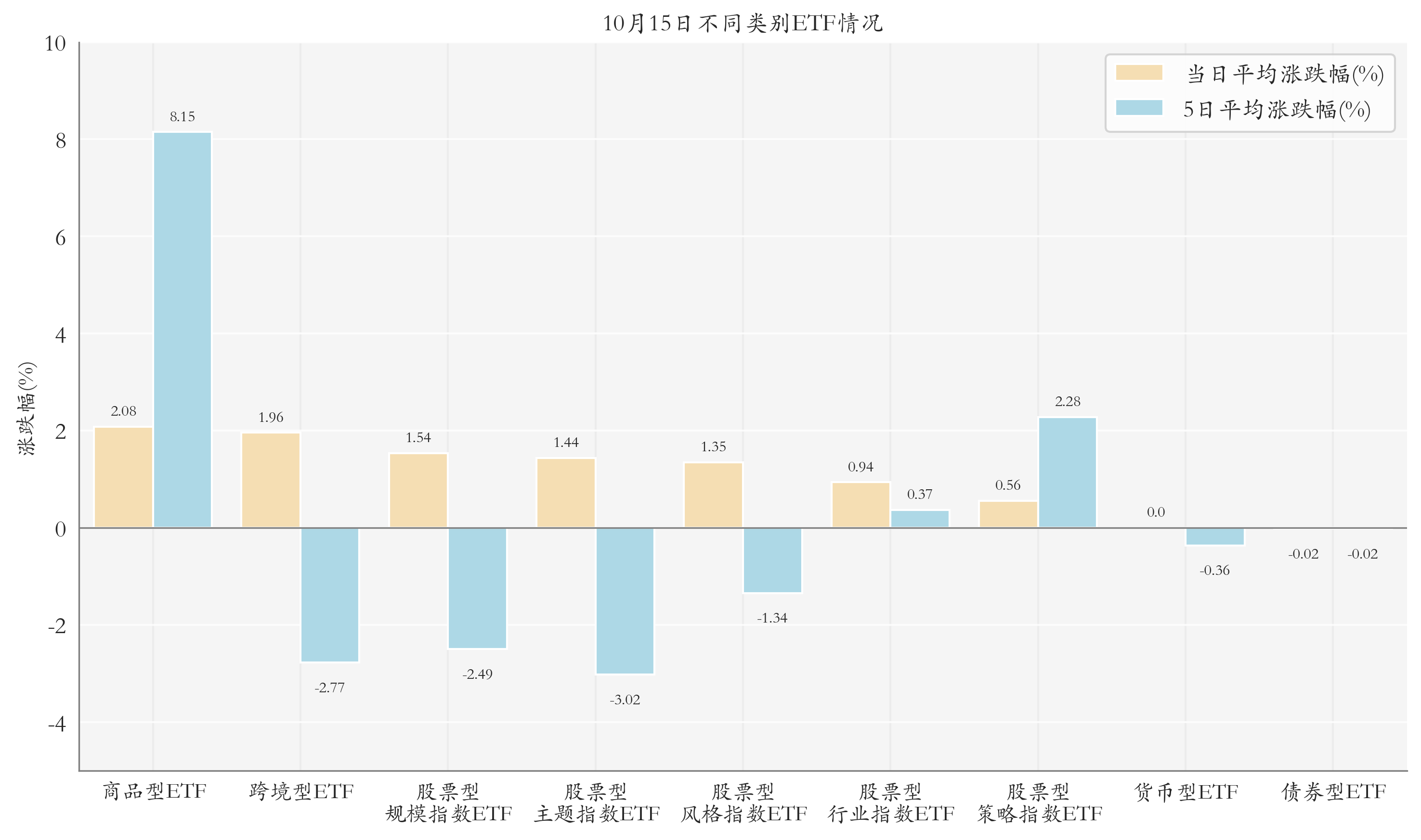 根据ETF基金的投资范围,将ETF基金划分为股票型规模指数ETF、股票型行业指数ETF、股票型策略指数ETF、股票型风格指数ETF、股票型主题指数ETF、债券型ETF、商品型ETF、货币型ETF、跨境ETF,今日商品型ETF表现最优,该类ETF的平均涨跌幅为2.08%;债券型ETF的表现最差,该类ETF的平均涨跌幅为-0.02%。