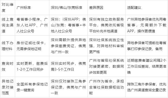 1. 区域差异补充:越秀区、天河区社保中心支持异地参保记录打印,番禺区、白云区可同步办理异地查询与待遇咨询,线下窗口均无需额外材料。