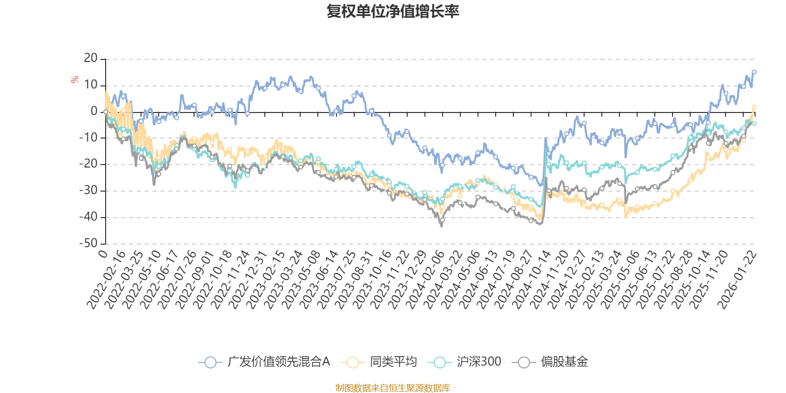 截至1月22日,广发价值领先混合A近三个月复权单位净值增长率为11.44%,位于同类可比基金37/49;近半年复权单位净值增长率为21.18%,位于同类可比基金38/49;近一年复权单位净值增长率为27.02%,位于同类可比基金40/46;近三年复权单位净值增长率为1.74%,位于同类可比基金25/30。