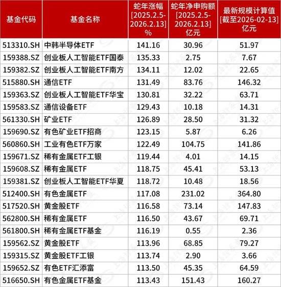 从资金流向看,蛇年涨幅居前的ETF,吸引了大量资金流入。其中,中韩半导体ETF净申购额超过30亿元,国泰通信ETF净申购额超过80亿元,南方有色金属ETF净申购额则超过230亿元。