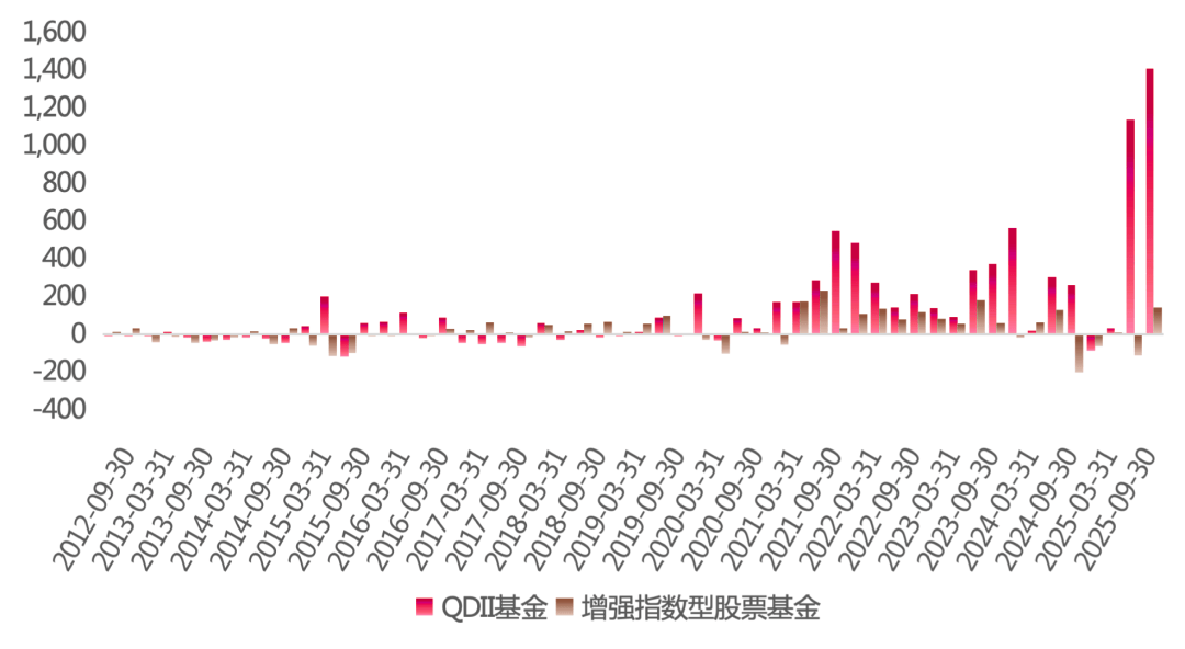 近两年国内市场承压,而以美国、部分新兴市场为代表的海外市场表现强劲,投资者进行全球资产配置,分散风险增厚收益的需求日益凸显。QDII基金自2021Q4开始净流入幅度明显升高,且近两年维持相对高位,2025年下半年净流入规模再创新高。