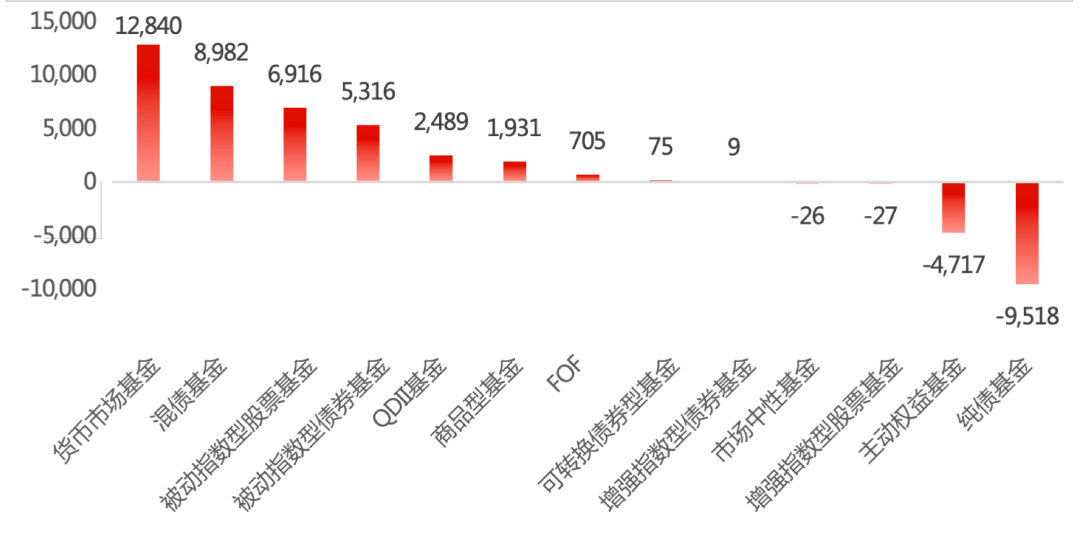 2012年3季度以来,公募基金净申购资金共计为28.04万亿。其中,净申购前三的分别是货基、纯债基金以及被动指数型股票基金。在被动指数投资的浪潮下,被动权益基金的净流入规模大幅增长,超过主动权益基金。纯债基金、“固收+”等产品的净流入规模有所下降。2025年前三季度,纯债基金净流出领跑市场。