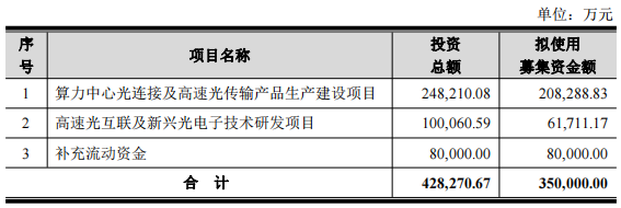 本次向特定对象发行股票募集资金总额预计不超过350,000万元(含350,000万元),在扣除发行费用后实际募集资金净额将用于算力中心光连接及高速光传输产品生产建设项目、高速光互联及新兴光电子技术研发项目、补充流动资金。