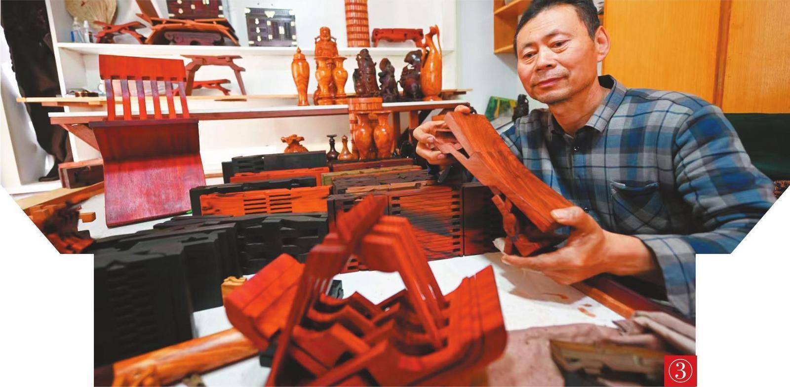 ③沈阳新民市大红旗镇鲁班木艺传统技艺传承人姜勇正通过网络直播推广销售鲁班木艺。 本报记者 杨靖岫 摄