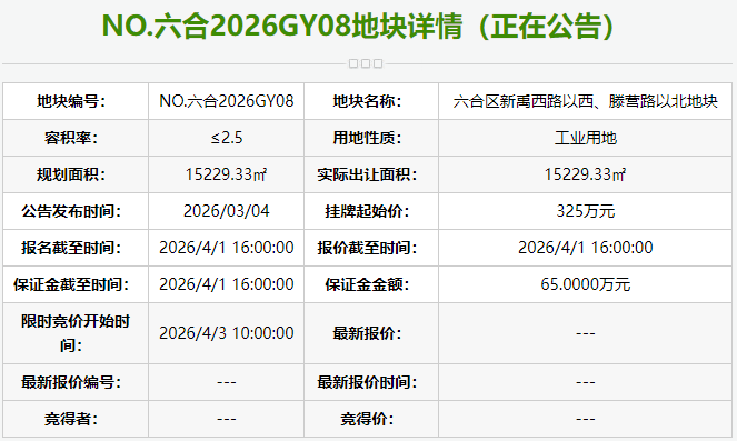NO.六合2026GY08地块为六合区新禹西路以西、滕营路以北地块。地块四至为:六合区横梁街道新禹西路以西、滕营路以北。规划用地性质为工业用地,出让面积15229.33平方米,容积率1.5≤Far≤2.5,建筑高度H≤24米。挂牌起始价325万元。