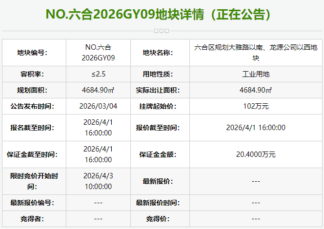 NO.六合2026GY09地块为六合区规划大雅路以南、龙源公司以西地块。地块四至为:六合区雄州街道规划大雅路以南、龙源公司以西。规划用地性质为工业用地,出让面积4684.90平方米,容积率1.5≤Far≤2.5,建筑高度H≤24米。挂牌起始价102万元。