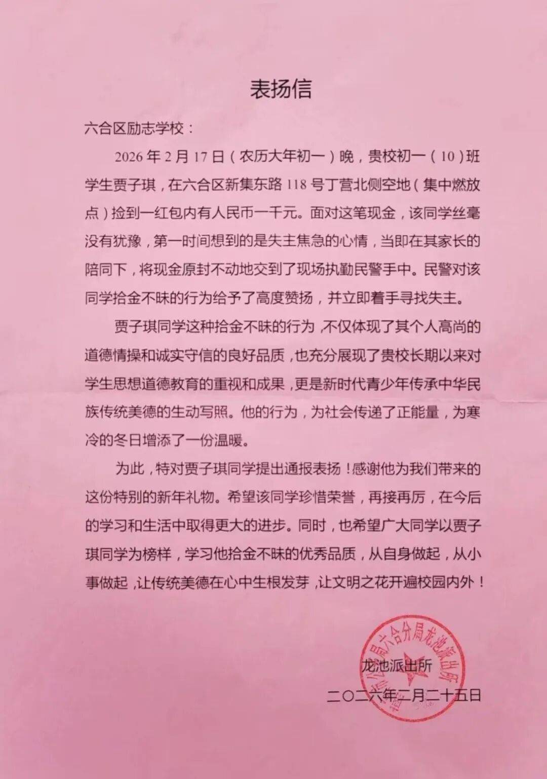 为表彰先进、传递正能量,龙池派出所民警特意在学校举行开学典礼之际,亲手将表扬信送到贾子琪同学手中,并对他拾金不昧的优秀品质给予高度赞扬。