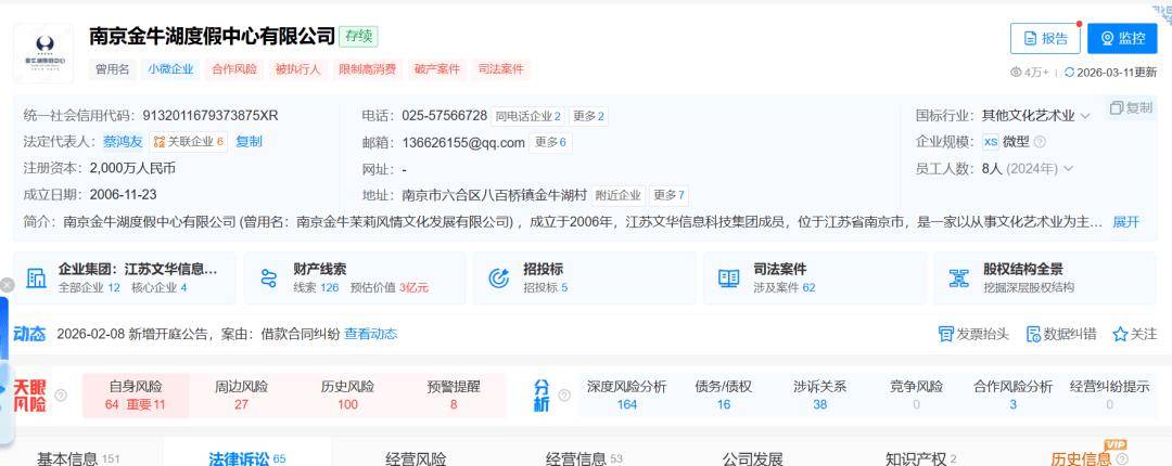 天眼查显示,南京金牛湖度假中心有限公司(曾用名:南京金牛茉莉风情文化发展有限公司),成立于2006年,江苏文华信息科技集团成员,位于江苏省南京市,是一家以从事文化艺术业为主的企业,企业实缴资本2000万人民币。