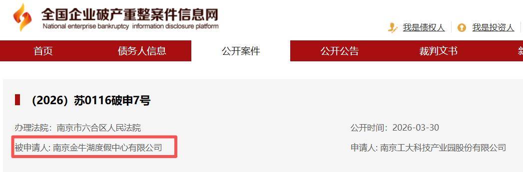 3月30日,“全国企业破产重整案件信息网”显示,南京金牛湖度假中心有限公司被申请破产审查,申请人为南京工大科技产业园股份有限公司,办理法院为南京市六合区人民法院。